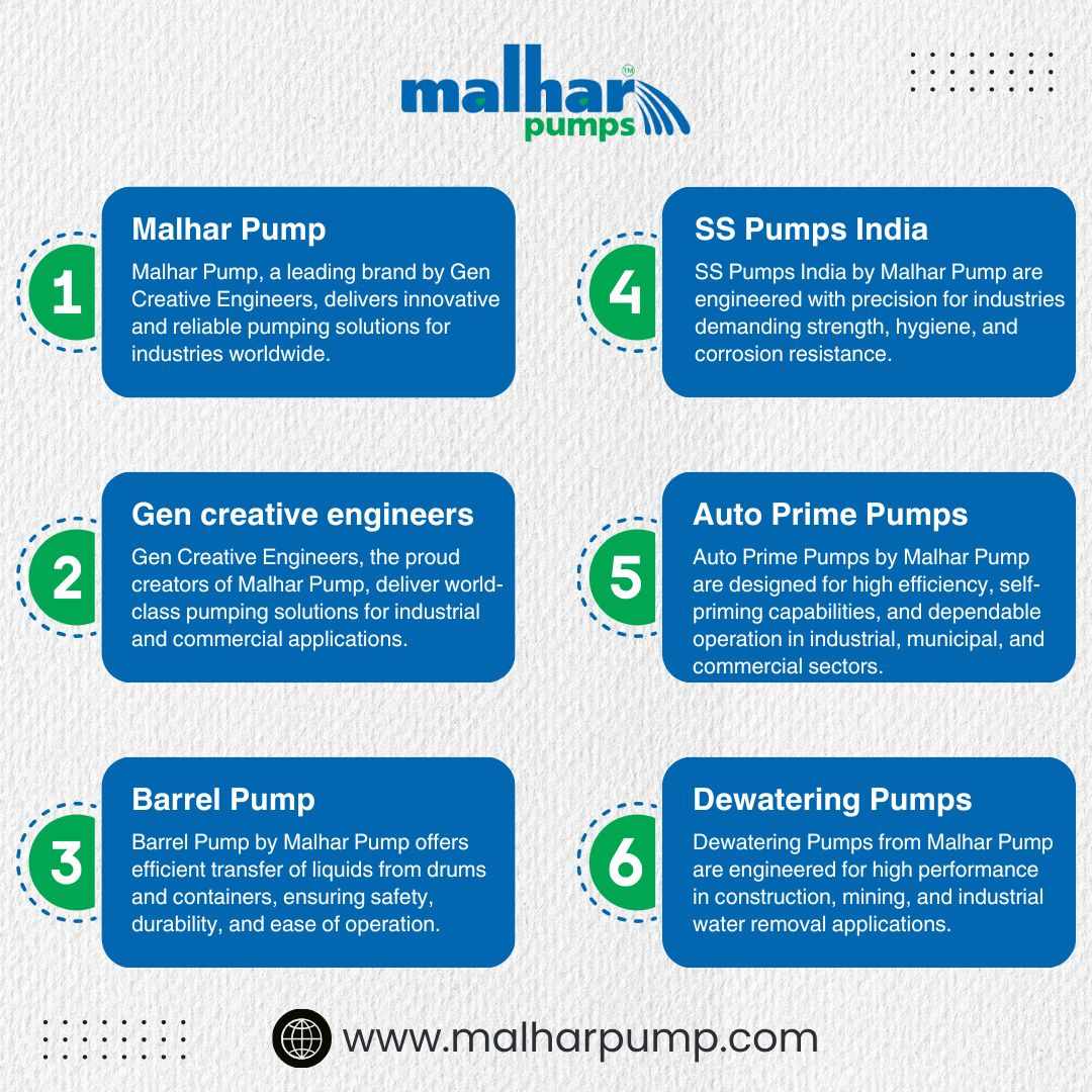 Gen Creative Engineers, the proud creators of Malhar Pump, deliver world-class pumping solutions for industrial and commercial applications. With decades of engineering excellence, we specialize in auto prime pumps, dewatering pumps, fire pumps, barrel pumps, flameproof pumps, and stainless steel pumps. Our commitment to innovation, durability, and quality makes Gen Creative Engineers a trusted name in India and international markets for reliable pump manufacturing.